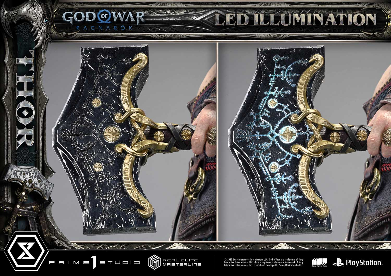 • LED Light-Up Features (angry eyes, Left-arm Mjölnir, summoning effect)